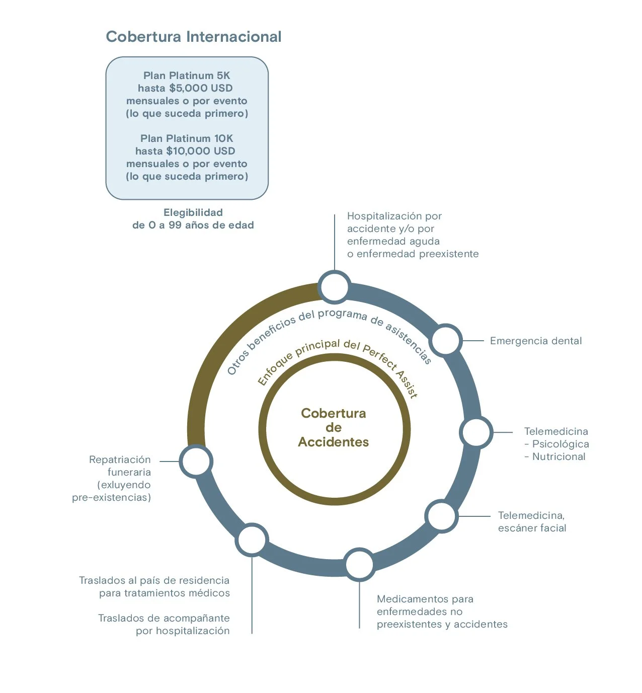 Perfect Assist es un innovador plan de cobertura de asistencias diseñado específicamente para ofrecer protección integral contra accidentes, con opciones de cobertura flexibles de hasta 5,000 por evento o por mes, lo que ocurra primero. Este plan destaca por su cobertura global, brindando asistencia tanto en el país de residencia como internacionalmente, sin deducibles, asegurando el 100% de cobertura en casos de accidentes. Además de su fuerte enfoque en accidentes, Perfect Assist extiende su protección a hospitalizaciones por enfermedades agudas y preexistentes, e incluye servicios como telemedicina y médicos a domicilio en caso de accidente, reafirmando su compromiso con el bienestar y la tranquilidad de sus usuarios en cualquier situación y lugar.